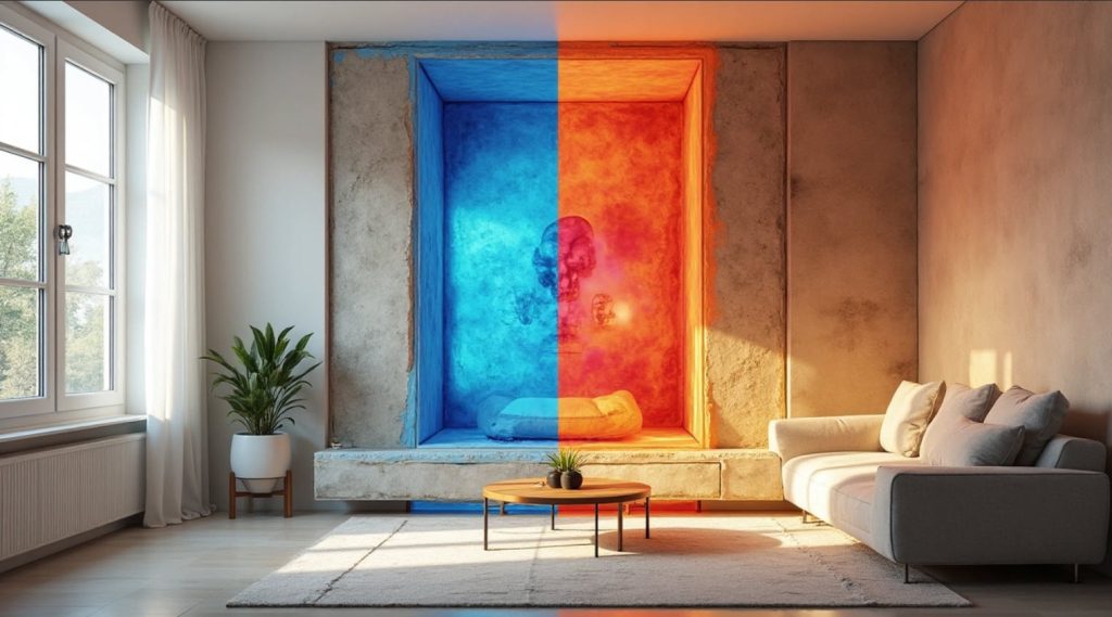 El aislamiento interior, instalado en las paredes internas, suele ser más económico pero reduce ligeramente el espacio habitable. En contraste, el aislamiento exterior (SATE) envuelve completamente el edificio, eliminando puentes térmicos y protegiendo la estructura contra elementos externos.